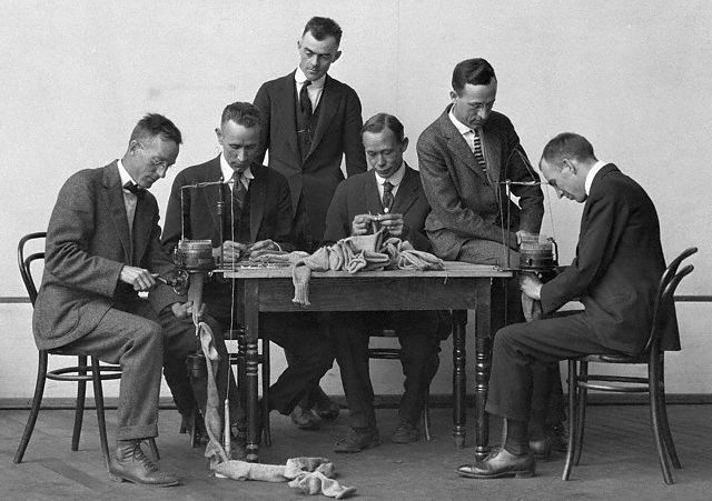 Empleados de la General Electric Company tejen calcetines y bufandas para los soldados de la Primera Guerra Mundial, 1918 (EE.UU.) | Employees at the General Electric Company knit socks and scarves for WWI soldiers, 1918 (USA)