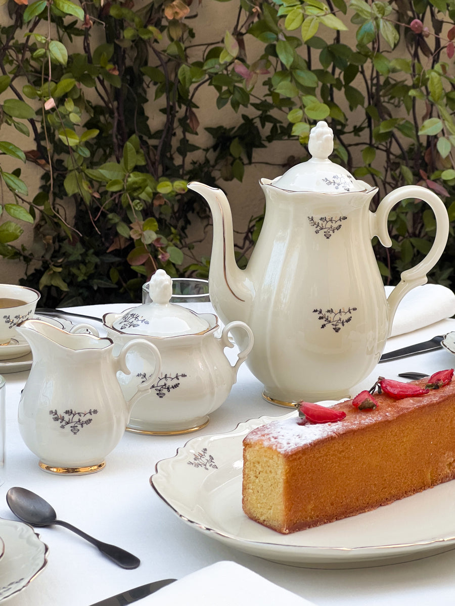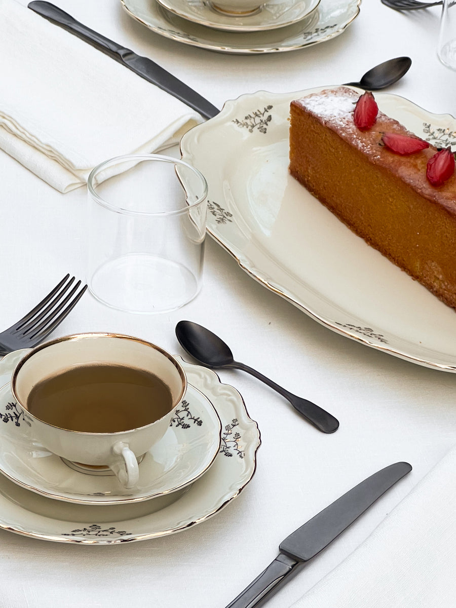 Para esta merienda, hemos combinado una vajilla antigua Alice de porcelana procedente de Suecia, con mantel blanco de lino italiano Amelia, servilletas de nuestra colaboración con la artista neoyorkina Carly Kuhn x Villa Las Perelli, cubertería Biarritz en acabado lavado negro y vasos anchos M de nuestra cristalería Ondarreta.