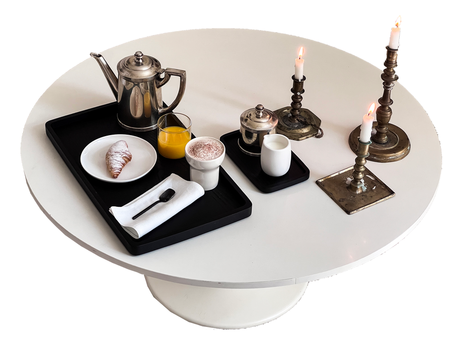Hemos preparado este desayuno sobre bandejas de madera carbonizada de la colección Passe-Partout, con cafetera y azucarero antiguos, taza diseñada por John Pawson, zumo de naranja recién exprimido en vaso ancho M de nuestra colección Ondarreta, jarrita de leche de porcelana de la colección Passe-partout, croissant con azúcar glass sobre plato llano S de la colección Base y servilleta de cóctel en lino 100% italiano modelo Fuencisla. Sobre la mesa, candelabros antiguos para decorar y disfrutar de la calidez de las velas.
