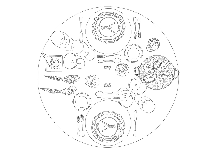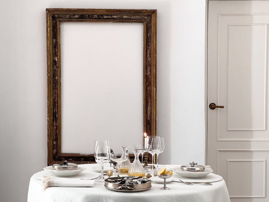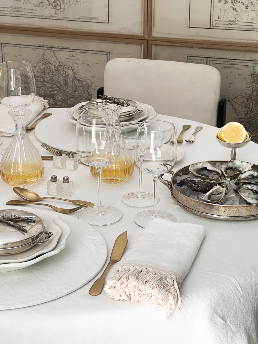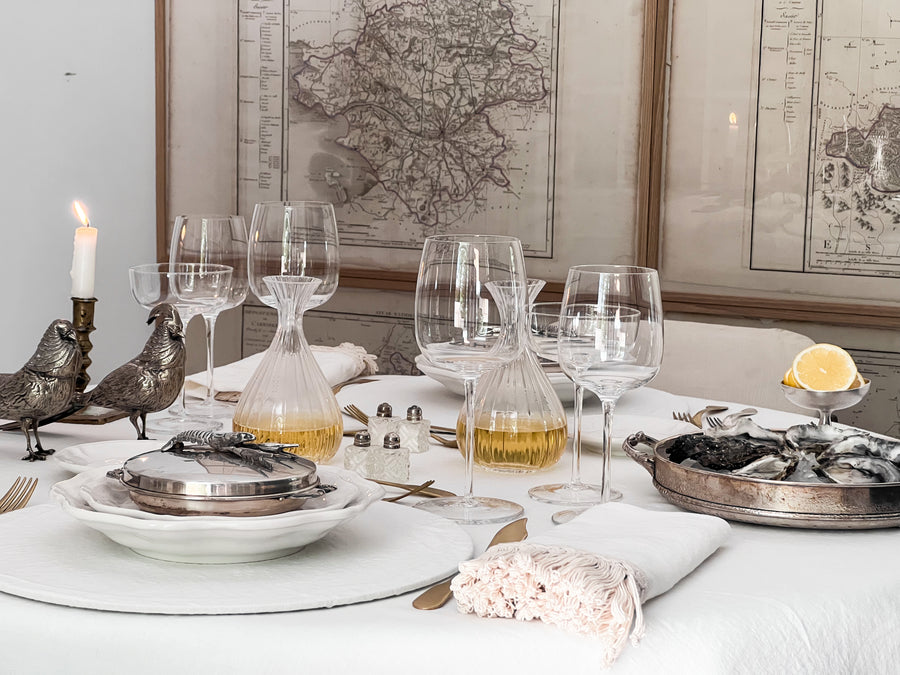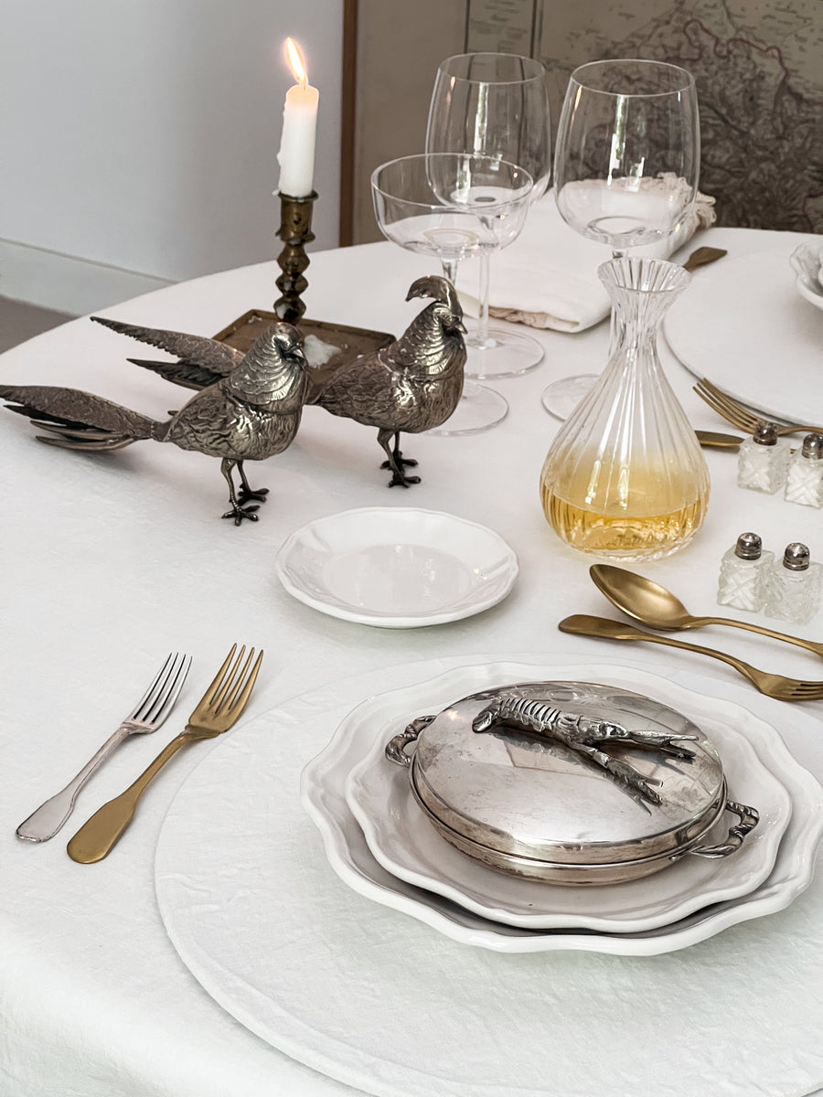 Hemos utilizado mantel cuadrado e individual redondo de nuestra colección Amelia y servilletas con flecos largos modelo Cristina, plato llano, hondo y pan de barro artesanal de la colección Rosario fabricada para Villa Las Perelli, cubertería Biarritz en acabado dorado, jarras individuales veteadas Inku, copas de vino y champagne de la colección Passe-Partout; y piezas antiguas como las fuentes plateadas, los saleritos, las copitas con el limón, el candelabro y la pareja de faisanes.