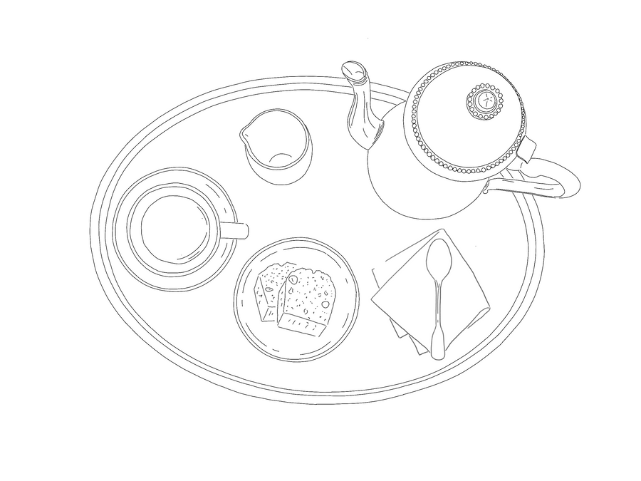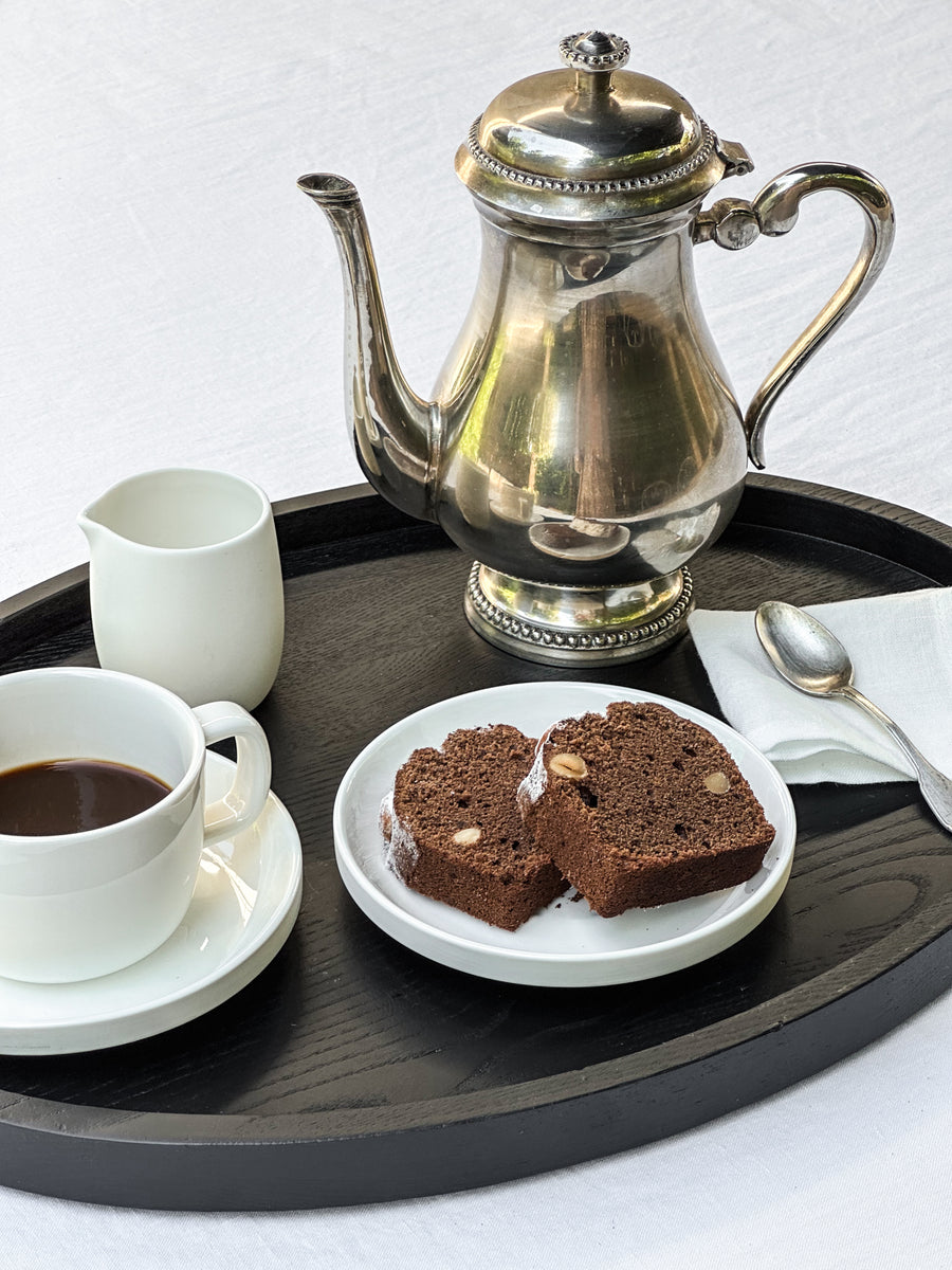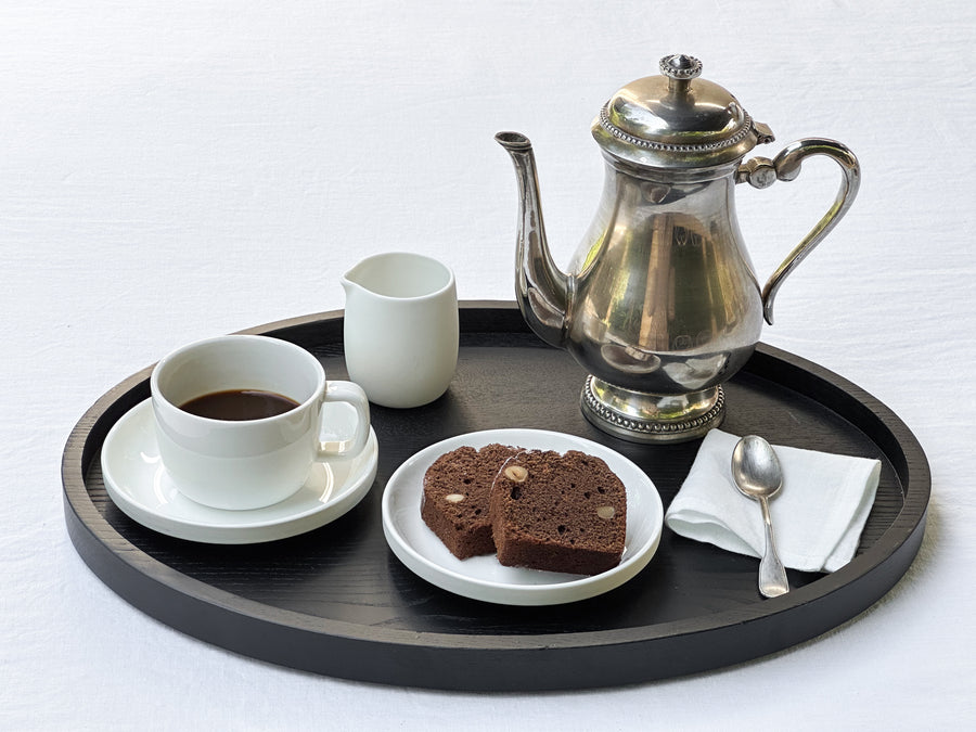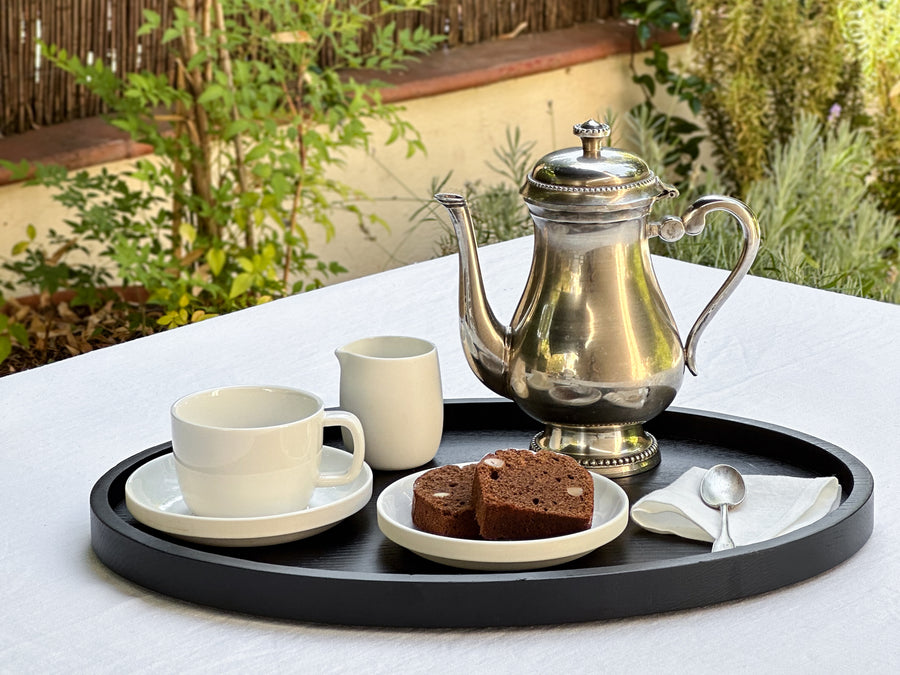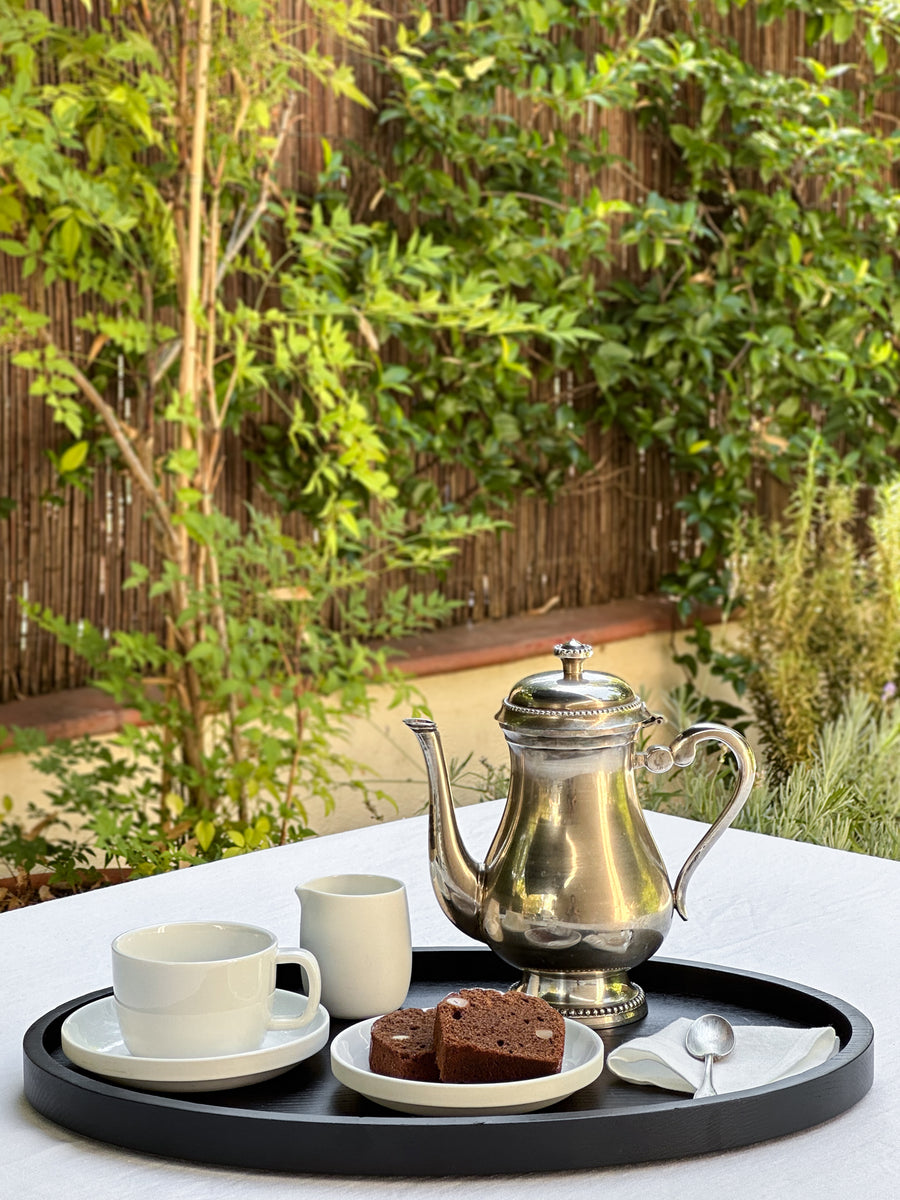 Para este desayuno, hemos combinado cafetera antigua con bandeja de madera negra, taza de cappuccino/te con plato, jarrita de leche de porcelana y plato llano XS de la colección Passe-Partout; servilleta de cóctel de la colección Fuencisla y cuchara de moka acabado lavado de la colección Biarritz.