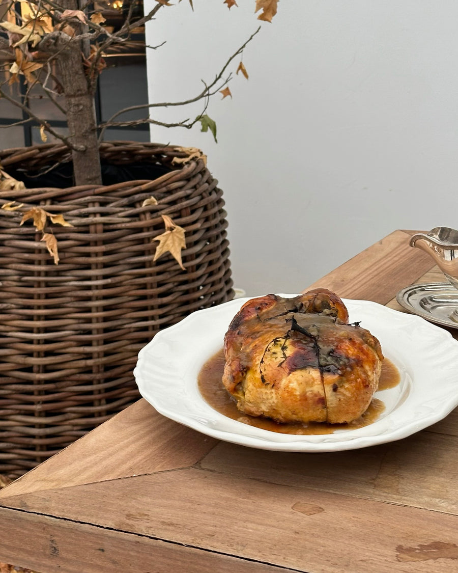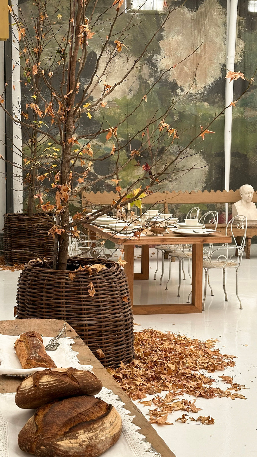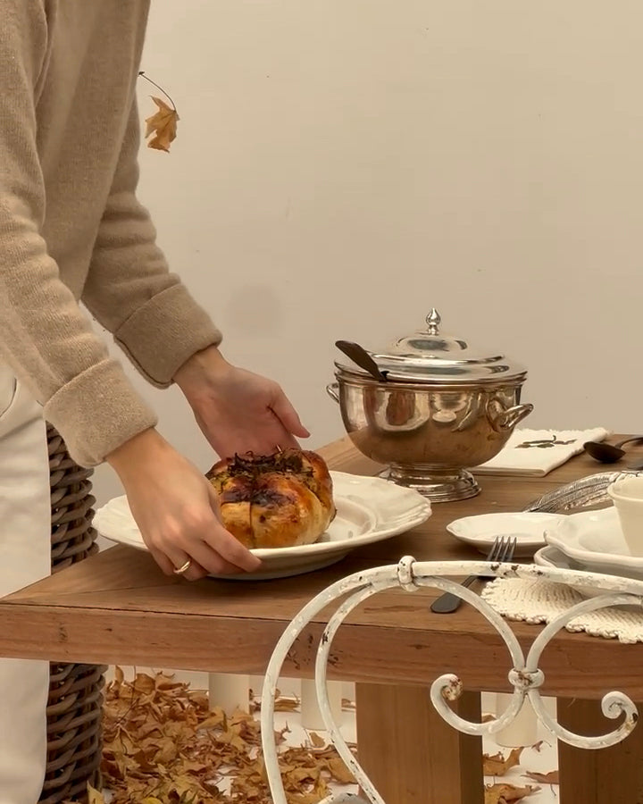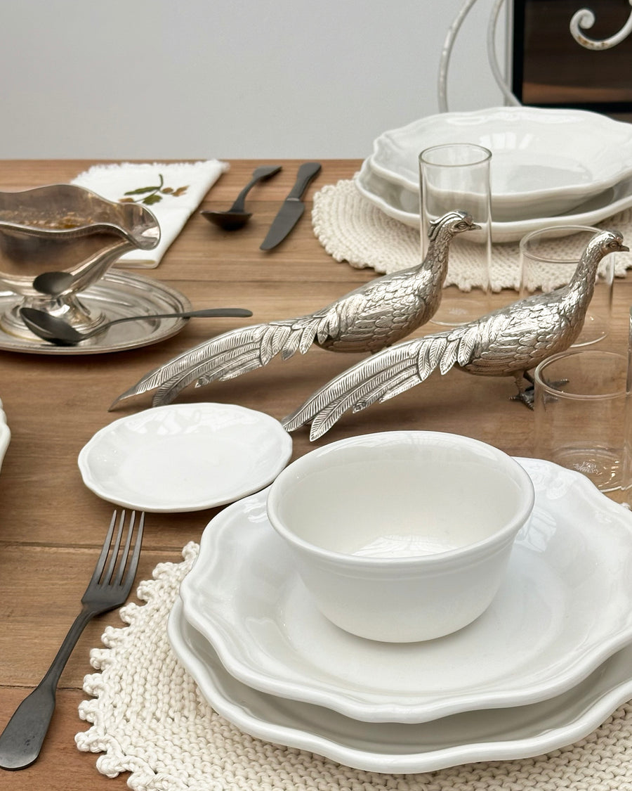 Para nuestra comida de Thanksgiving en Berenis, utilizamos para cada comensal plato llano, plato hondo, bol y plato de pan de nuestra vajilla Rosario sobre individual de punto tejido a mano de nuestra colaboración con Isabel Prieto, vasos L y vasos anchos M de nuestra cristalería Ondarreta, cubertería Biarritz en acabado lavado negro y servilletas de lino 100% italiano Melita con bordado de bellotas hecho a mano edición limitada. Utilizamos nuestras bandejas de la colección Rosario para emplatar el pavo y la ventresca con pimientos, y una selección de piezas antiguas para el resto del menú. Servimos un caldo caliente en una antigua jarra de metal plateado, la fabada en una sopera antigua plateada y la salsa del pavo en una salsera antigua procedente de Inglaterra. Por último, decoramos con una elegante pareja de faisanes de plata.