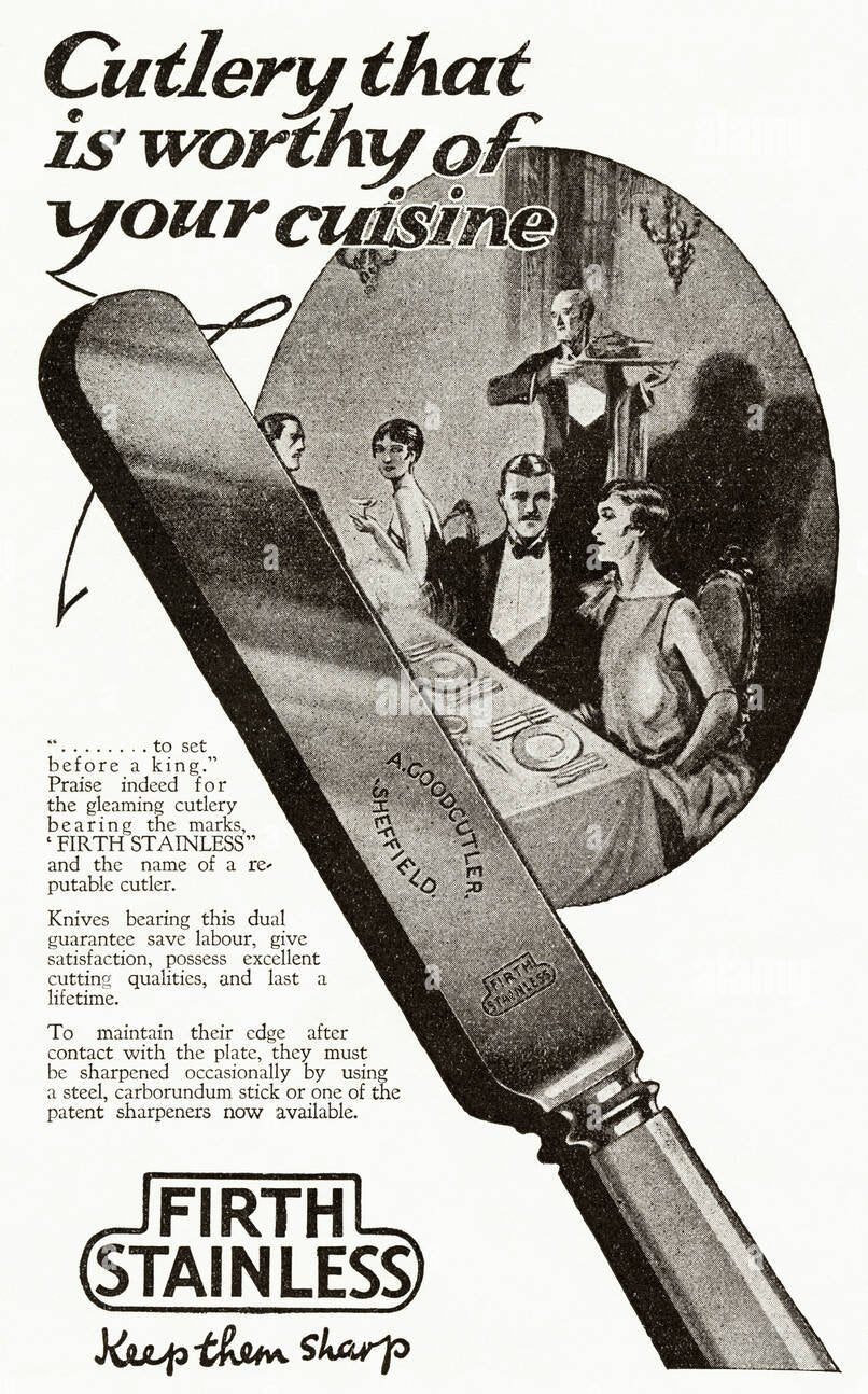 Anuncio en una revista de la firma Firth Stainless, alrededor de 1928