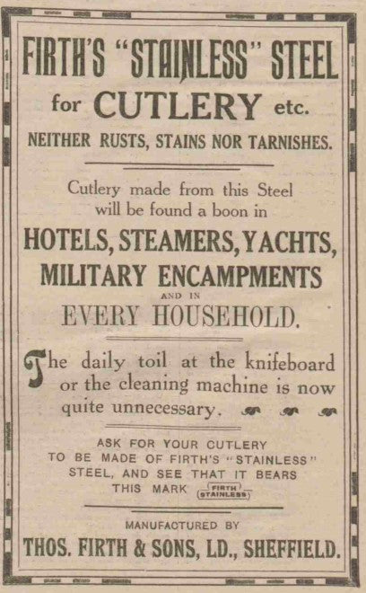 Anuncio de diciembre de 1914 de Firth-Brearley Stainless (Sheffield Daily Telegraph). Imagen cortesía de Geoff Tweedale