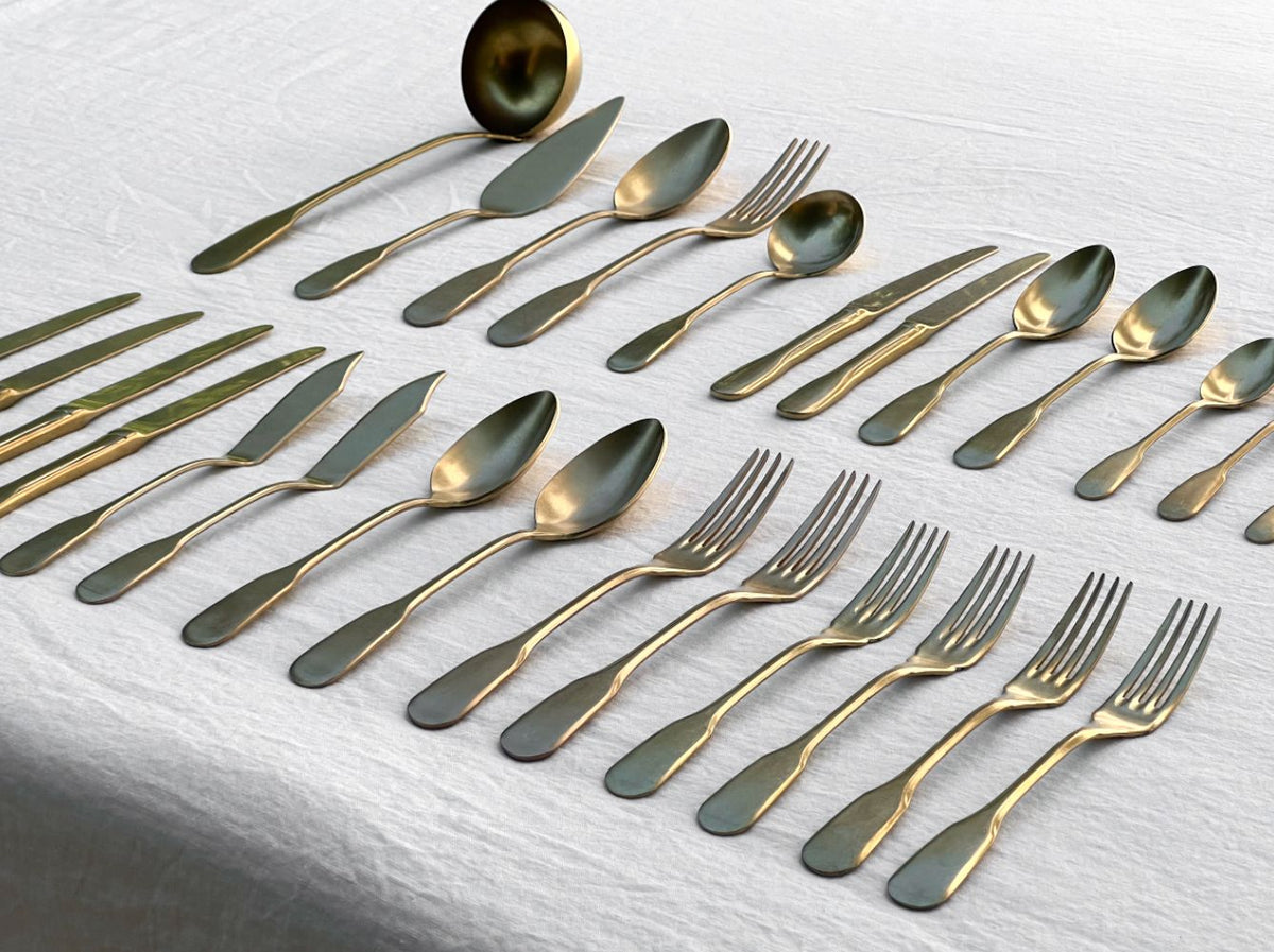 Cubertería en acero inoxidable acabado lavado dorado mate, a la venta en Villa Las Perelli
