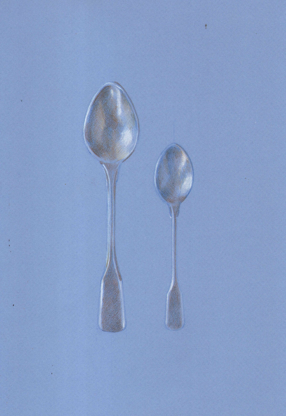Dibujo de piezas de cubertería en lápiz sobre papel Canson, de Francisco Solé y Fuencisla del Amo