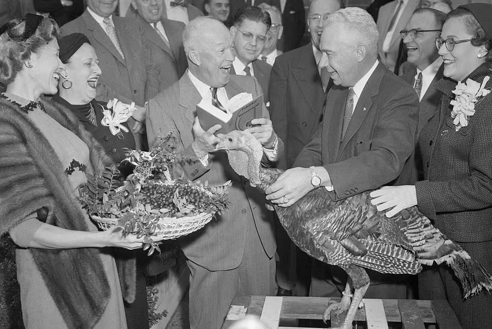 Fotografía del presidente Eisenhower dando de comer a un pavo que recibió de la Turkey Foundation el 4 de noviembre de 1954, en la Casa Blanca. Fuente: Archivos Nacionales