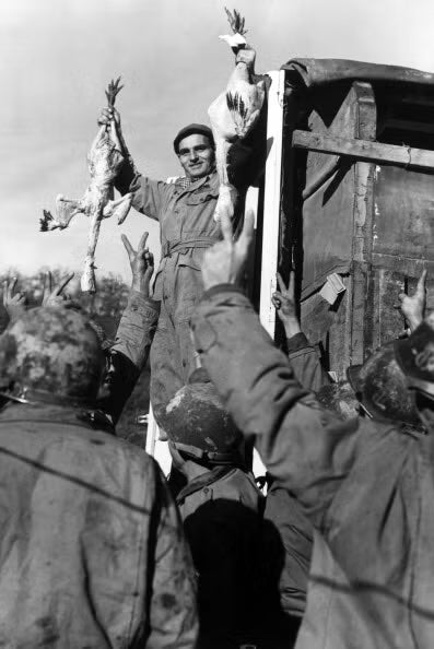 Fotografía de un soldado del ejército de Estados Unidos con dos pavos que iban a tomarse en Thanksgiving durante la guerra