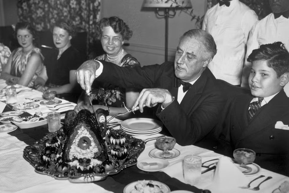 Fotografía del Presidente Roosevelt trinchando el pavo de Acción de Gracias en 1938, en Warm Springs, Georgia