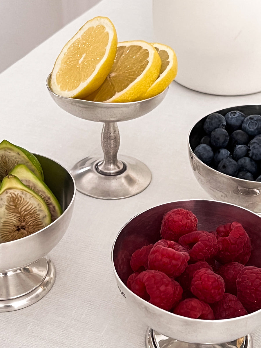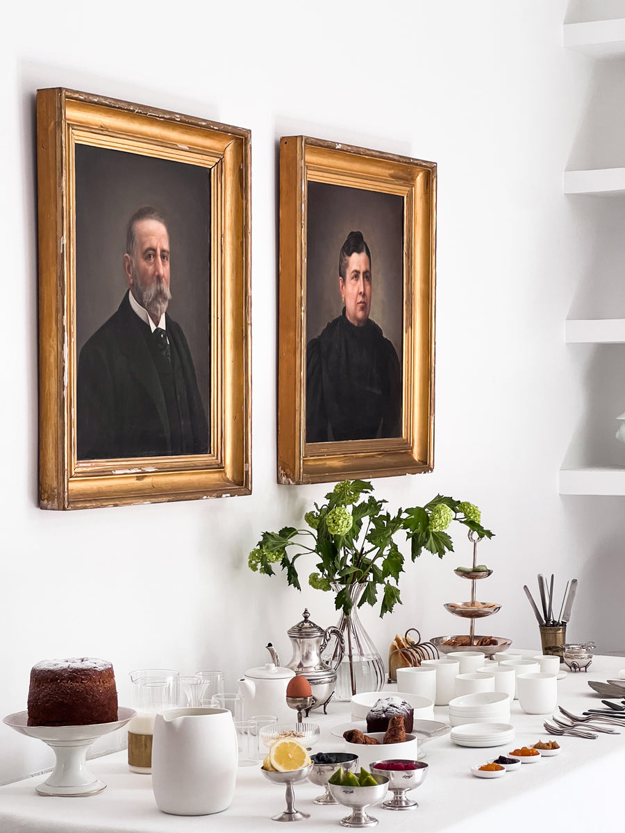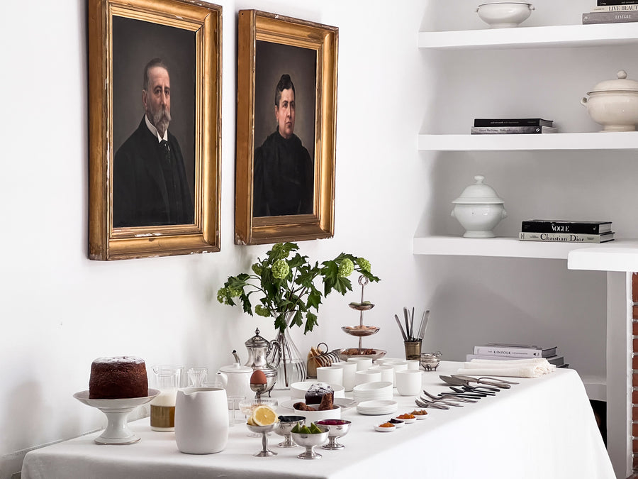 For this "moment" we used Amelia tablecloth and Maria Elena napkins in 100% linen made in Italy. Cups (cappuccino, coffee and espresso), plates, bowls, teapot and jug in white porcelain from the Base collection, antique pedestals in white Limoges porcelain with gold details, Copper Chemistry jug with copper handle, glasses from the Ondarreta collection, champagne glass with yoghurt and veined jug used as a vase from Inku; and antique silver-plated pieces such as the fruit cups, the coffee pot, the toast rack, the cake stand, the sugar bowl, knives and serving cutlery.